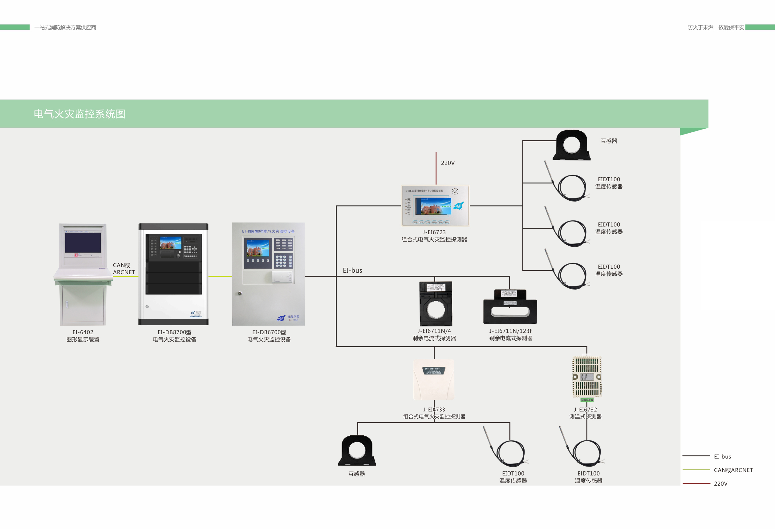 電氣火災監控系統與火災報警系統是相輔相成的,并將作為火災報警系統的一個(gè)子系統(火災預警系統)。本公司研發(fā)的 EI 系列電氣火災監控系統既可以自成系統,獨立使用,也可以接入消防控制室圖形顯示裝置,由消防控制室圖形顯示裝置顯示報警信息。