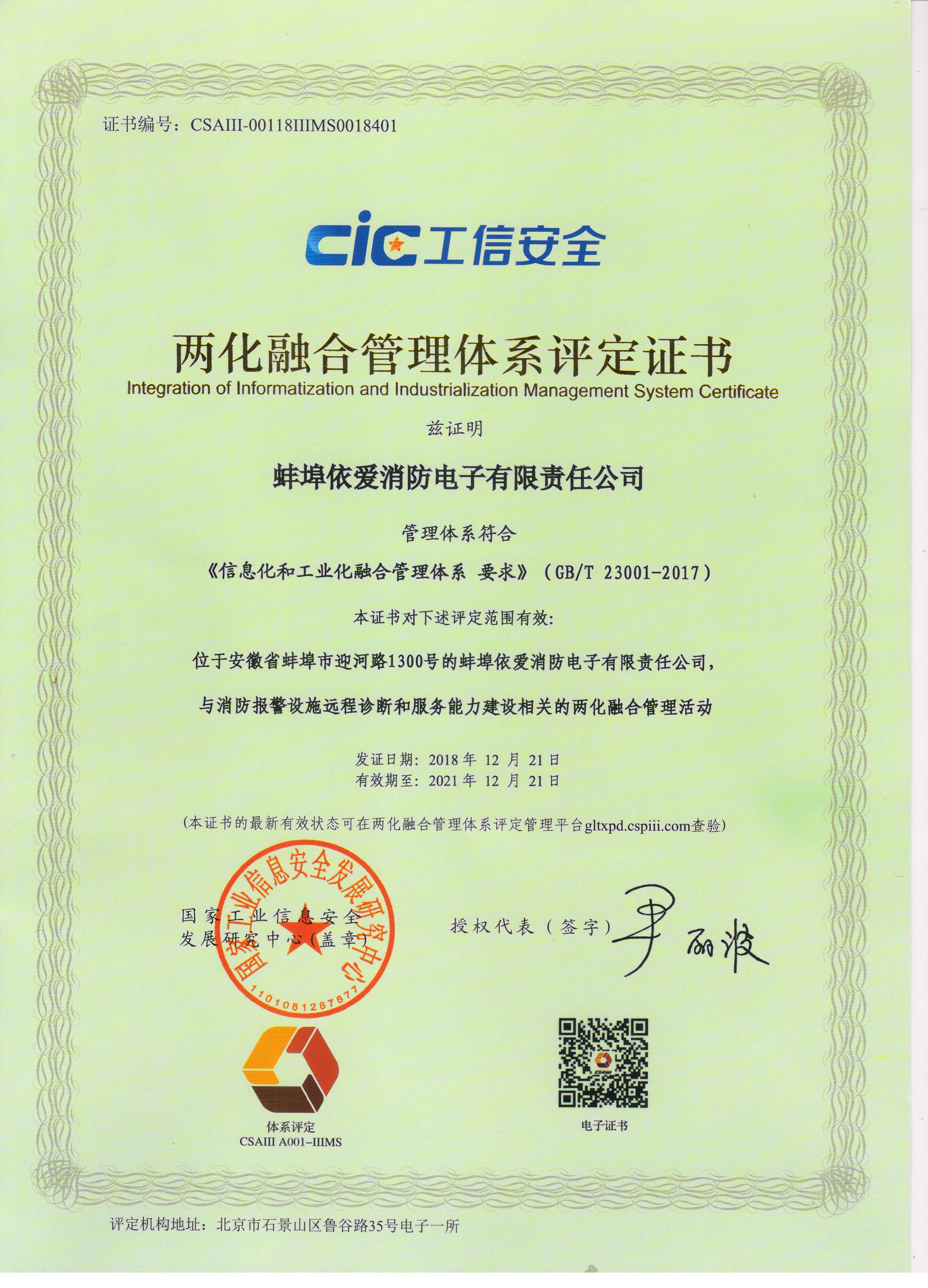 依愛(ài)消防兩化融合項目歷時(shí)一年,在公司管理層的指導及各業(yè)務(wù)部門(mén)的大力配合下,最終于2018年12月21日成功通過(guò)國家工信部審核并獲頒證書(shū)。