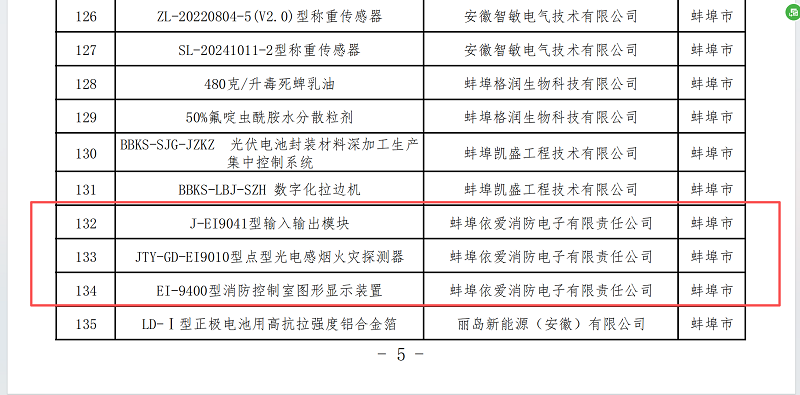近日,安徽省工業(yè)和信息化廳正式公示了《安徽省新產(chǎn)品(2025年第三批)擬確認名單》。經(jīng)過(guò)各地推薦、專(zhuān)家評審和廳長(cháng)辦公會(huì )審議,蚌埠依愛(ài)消防電子有限責任公司的J-EI9041型輸入輸出模塊、JTY-GD-EI9010型點(diǎn)型光電感煙火災探測器和EI-9400型消防控制室圖形顯示裝置三項創(chuàng )新產(chǎn)品成功入選,標志著(zhù)公司在智慧消防與電子技術(shù)領(lǐng)域的研發(fā)實(shí)力再獲權威認可。
